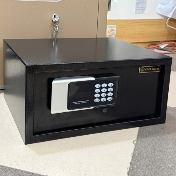 Trong phòng khách sạn, két sắt cần dễ thao tác để khách dùng ngay, đồng thời cần dễ xử lý khi phát sinh tình huống như quên mã hoặc cần hỗ trợ. KIVA KV-200TG (Xuân Hòa) là dòng két sắt khách sạn chuyên dụng theo hướng đó, nổi bật với khóa điện tử điều khiển tự động, thao tác bằng mã số, kèm chìa khóa + mã master để quản lý.