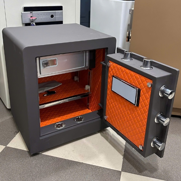 Két sắt Bokee BK45B đẹp sang trọng, nội thất bọc da màu cam để giấy tờ
